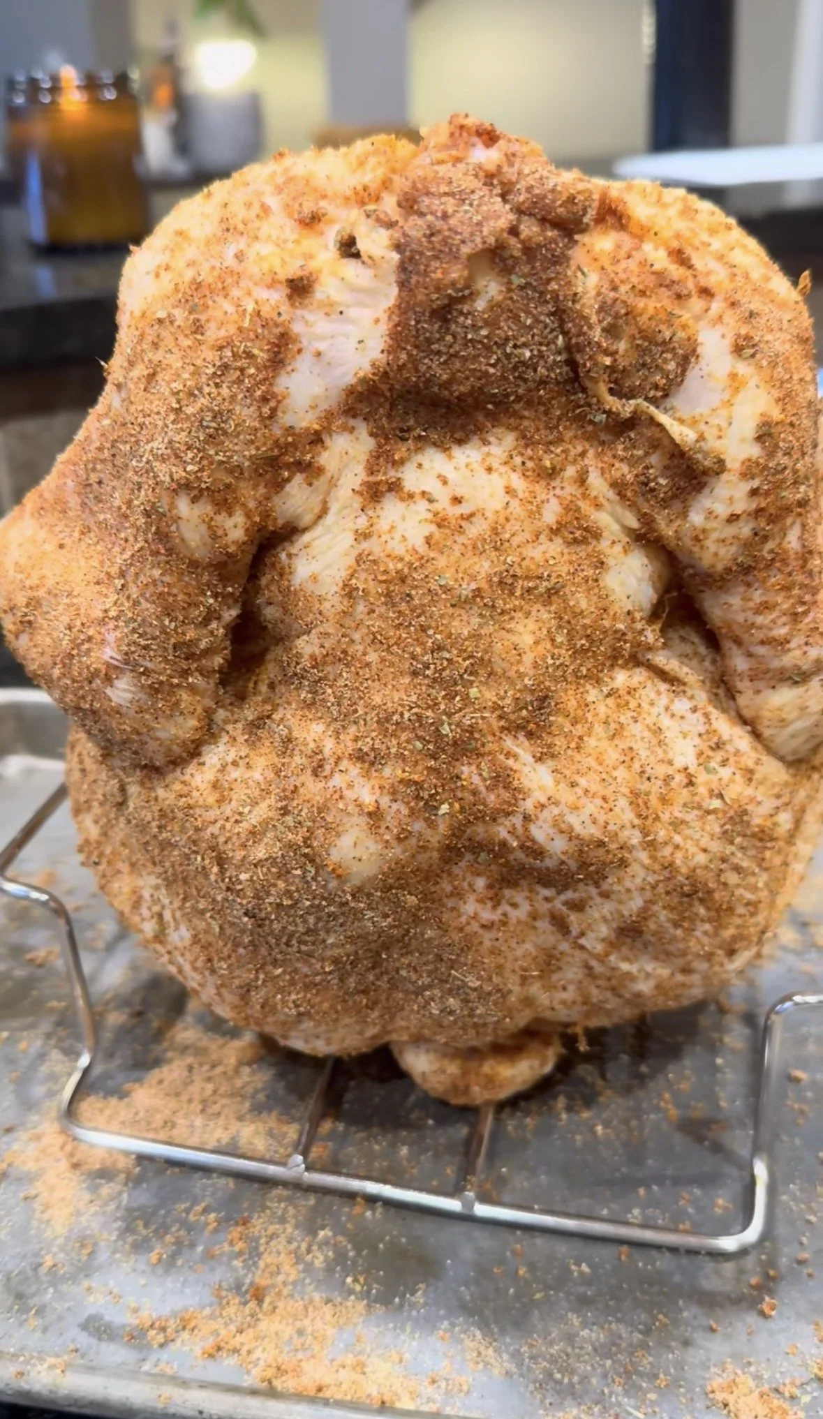 If you have a beer can chicken holder ( https://amzn.to/4iTxRYB ), then plop your beer in the holder and place your chicken over it. If you don’t have the holder, we’ve done it without, but it takes a little more finesse. Place your chicken over the beer can and tie the legs together with kitchen twine to try to balance the support.