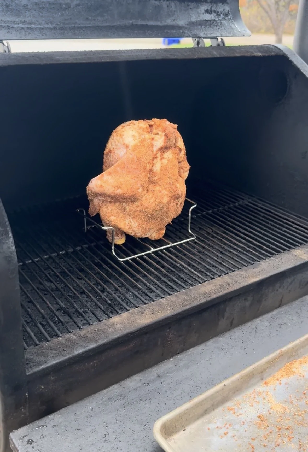 Place your chicken on your smoker and smoke for one hour. Then turn your smoker up to 350*F and cook until it reaches 160-165 degrees (depends on lbs, but should be an hour to an hour and a half)