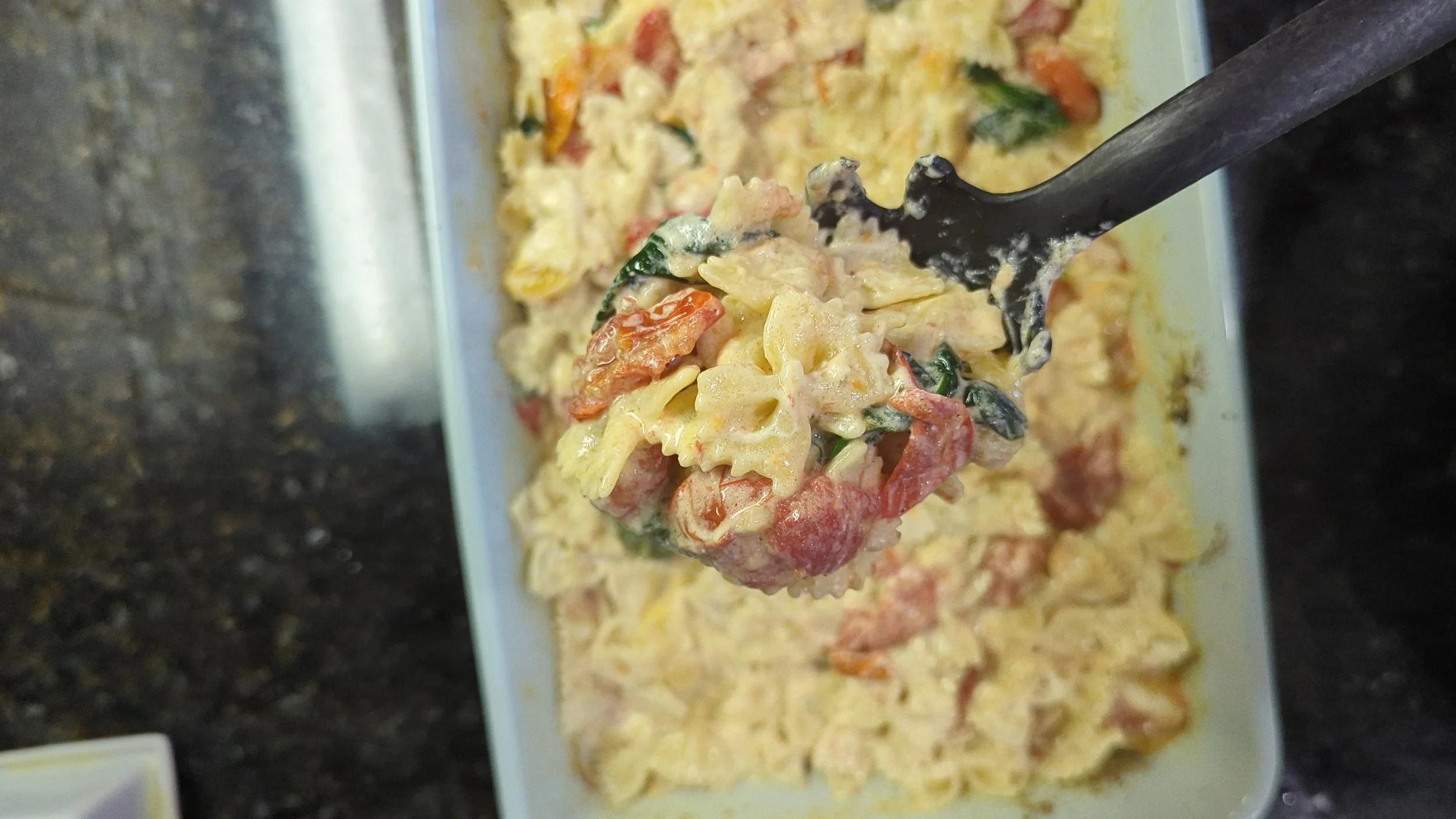 Add the pasta and spinach to your tomato mixture and stir it around. Then it’s ready to eat!