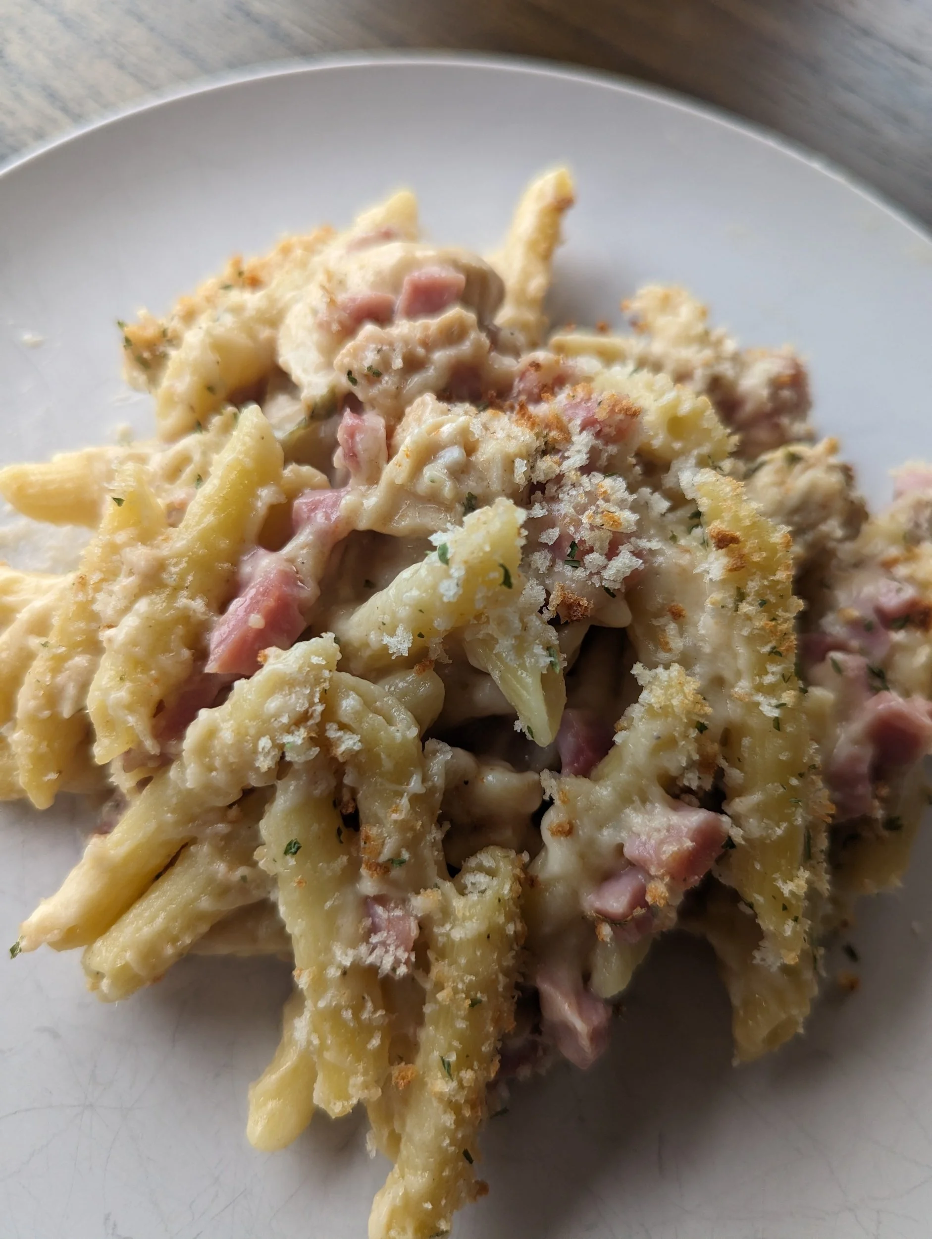 When pasta is done, reserve 1 cup cooking water and drain pasta. Add pasta to the cheese sauce and add pasta water until the sauce has thinned slightly and is sticking to the pasta. Add chicken and ham back to the pan—Now, if you have a pan that can go in the oven, good—if not, transfer to a casserole dish. Then top with panko and broil for a few minutes. Then it is ready to serve.