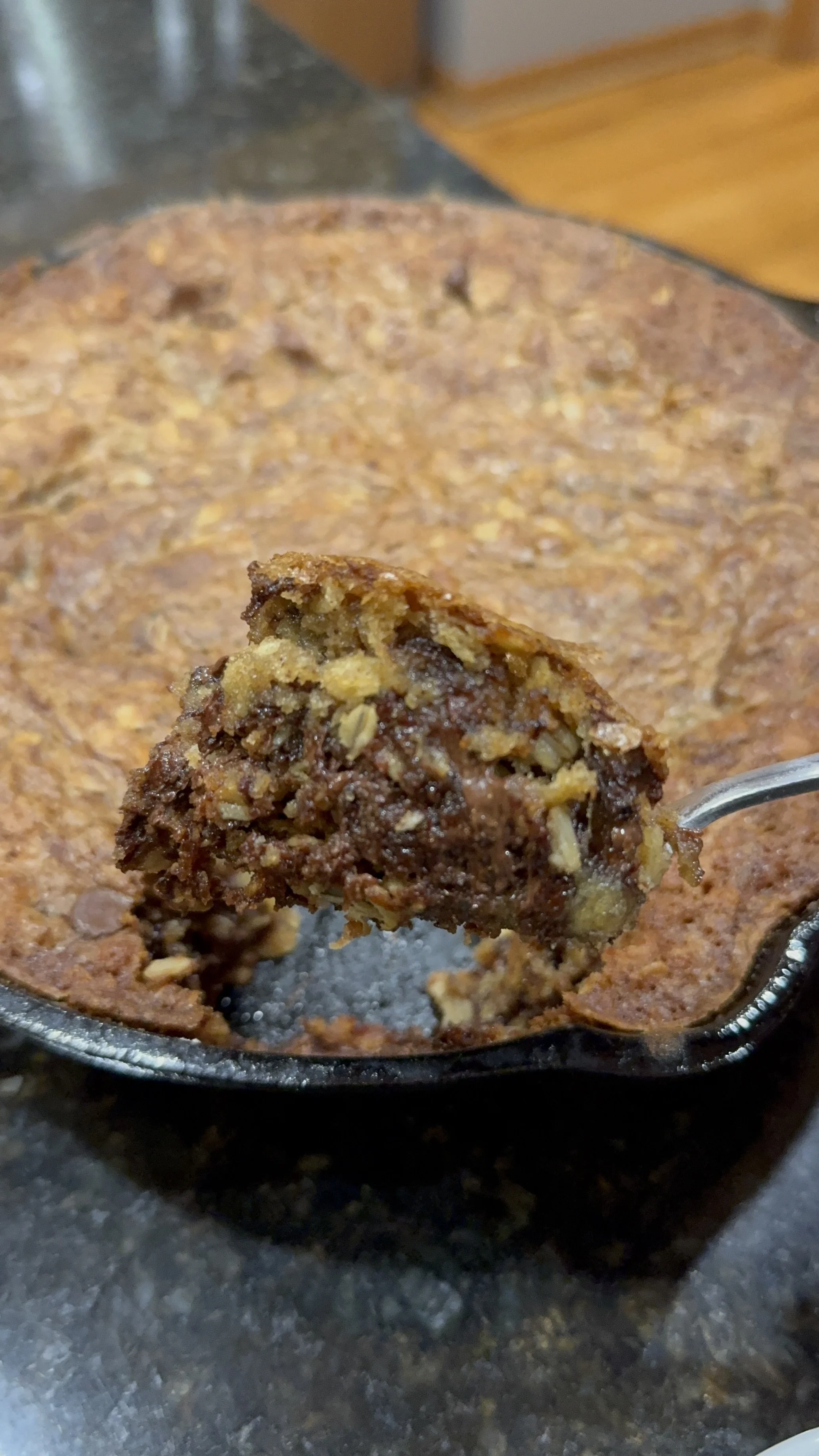 Add both sugars to the cast iron skillet and whisk to combine. Whisk in egg and vanilla and then add in the dry ingredients. Fold in the chocolate chips and press evenly all around the skillet.