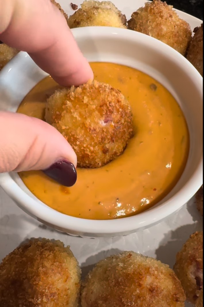 Form the balls with a medium-sized melon scooper. Roll them and then dredge them in flour, egg, and lastly, panko. Set into your heated oil and cook for 3 minutes. Flip them over and let them cook for another 2-3 minutes. These should be golden brown all around. Take it out of the oil and place it on a serving dish. Repeat until all of the balls are fried and perfectly golden brown. Serve with Thousand Island dressing and enjoy!