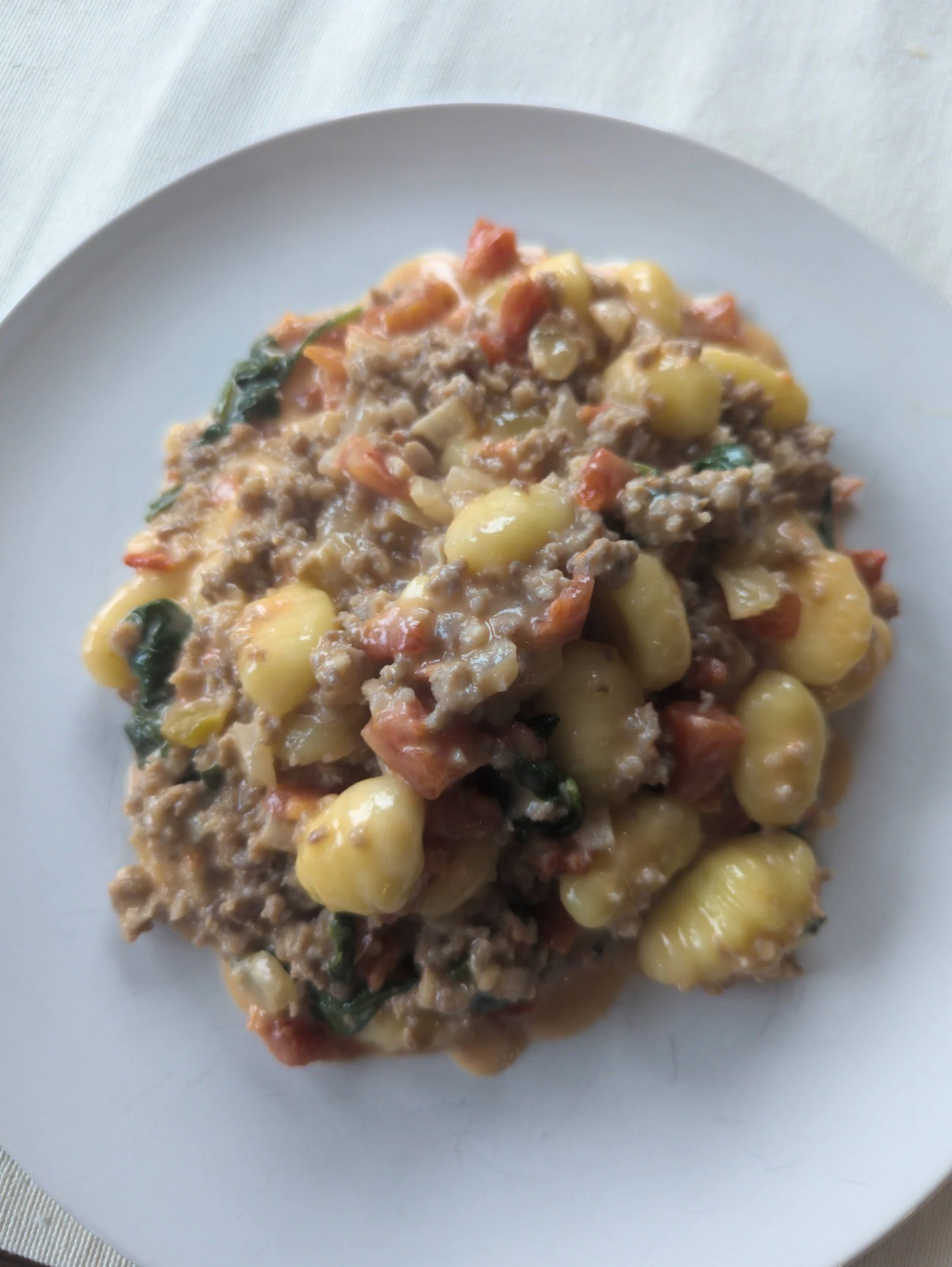 Saute the sausage and onion together until browned. Add garlic and stir. Add the white wine (or chicken broth) and let that cook for a minute. Add your diced tomatoes, heavy cream and gnocchi.